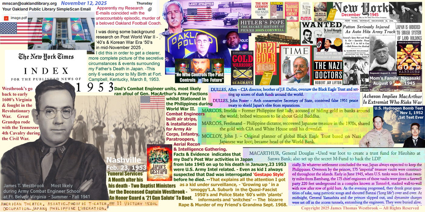 Post World War II, then current undeclared Korean War era during the start of U. S. National Security State and the rabidly Anti-Communist McCarthy Era.This latest, in a series recent of assassinations mislabled as in the multi-national, corporate mass media outlets seem to follow the progress I have made in the creation of this website all the way from Oakland, California, the University of Kentucky, Providence, Rhode Island, and the Northeast U.S., including the 'hit' on the MIT professor December 15, 2025 have prompted me to make this pre-mature website posting, just in case.
