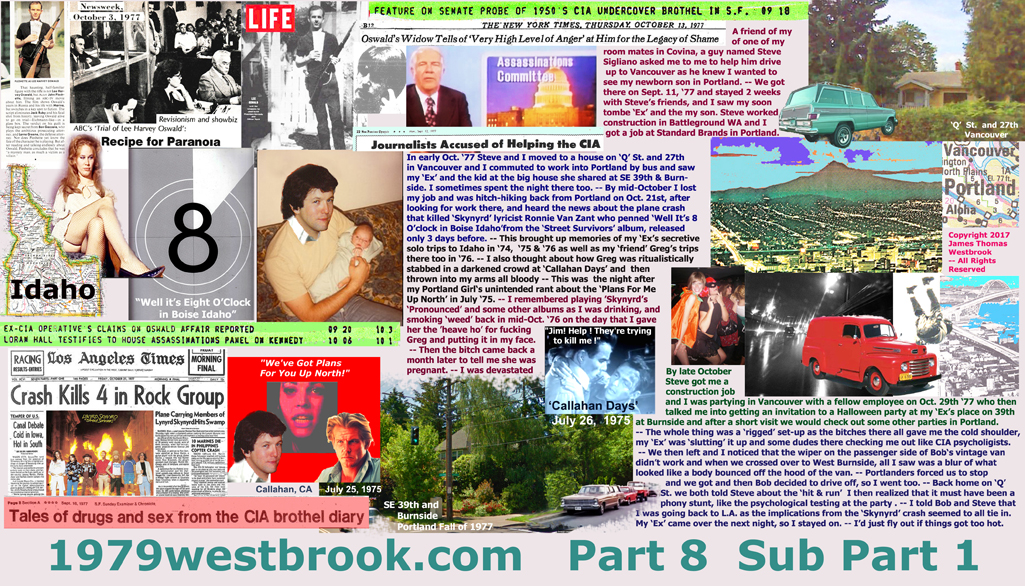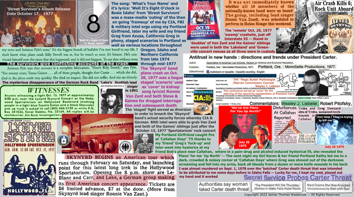 machinations behind what was an apparently phony plane crash, contrived as 'cover' to conceal the kidnapping, interrogation and murders of 'Lynyrd Skynyrd' rock band leader: Ronnie Van Zant and the band's two newest members Steve and Cassie Gaines.IThis is an expanded view 'blow up' of perhaps a relatively small, but incredibly important part of Part 8 Sub Part 1 of "1979" presently viewable online at: 1979westbrook.com