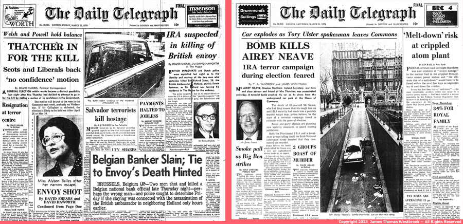 The apparent involvement of NATO 'Black Op's agents there in the triple assassinations British Ambassador Sykes, in The Hague, Netherlands, Financier Michaux in Brussels, Belgium hours later and British Parliament Member Neave at Westminster, London.