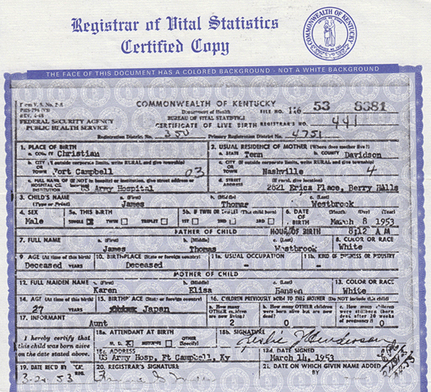 My father reportedly died in Yokahama, Japan in January 1953, only weeks before my birth at the U.S. Army hospital at Fort Campbell, Christian County, Kentucky on March 8, 1953 and although she was only just a month shy of age 5, my sister Mary, who died in 2004, told me how she was holding my father's hand when he collapsed in a train and fell down at her feet. -- This differs from official accounts that I have read in the Nashville newspapers.